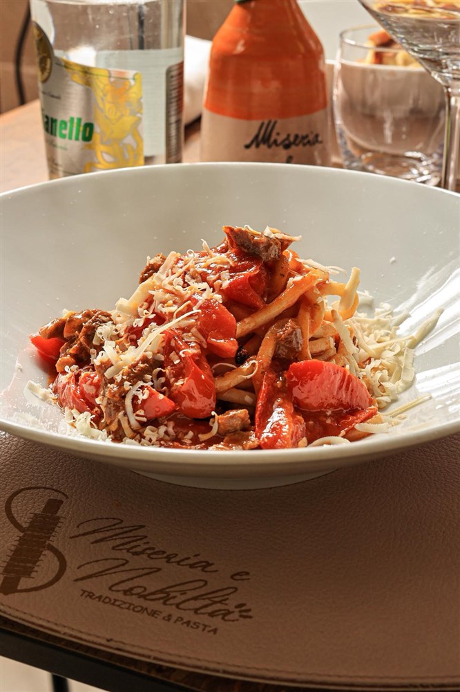 Negli anni i nostri spaghetti sono diventati sempre più un prodotto unico ed irresistibile, grazie alla decisione di utilizzare solo semola locale per produrli e trafilando l’impasto rigorosamente a “bronzo”, da una trafila richiesta appositamente per “La Spaghetteria Miseria e Nobiltà” dalla quale nasce uno spaghetto che richiama alla tipica “Maqquarnàr” locale.